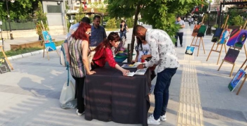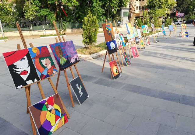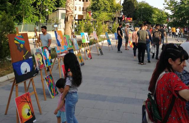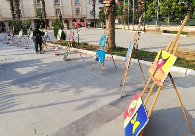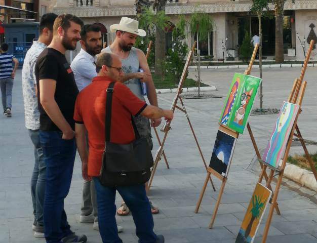 Nusaybin'de Damla Koleji öğrencileri tarafından bir yıldır yapılan resimler Cumhuriyet Meydanında sergilendi.