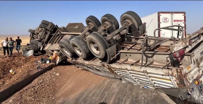 Nusaybin'e bağlı Girmeli Mahallesi mevkiinde tır ile traktörün karıştığı kazada un yüklü tır devrildi.
