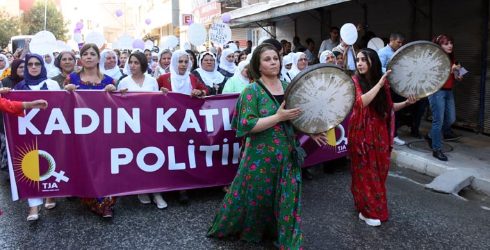 Aralarından HDP Milletvekilleri Meral Danış Beştaş, Hüda Kaya, Züleyha Gülüm, Dersim Dağ, Ebru Günay, Pero Dündar ve Remziye Tosun ile Nusaybin Belediye başkanı Semire Nergiz ve HDP'li kadın yöneticilerinin de olduğu grup HDP İlçe binası önünde bir araya geldi.