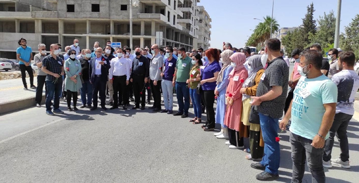 Memur Sen İl başkanı Eyüp Değer, Eğitim Bir Sen yöneticileri ve öğretmen ellerinde karanfillerle Mardin Yolu caddesine geldi.