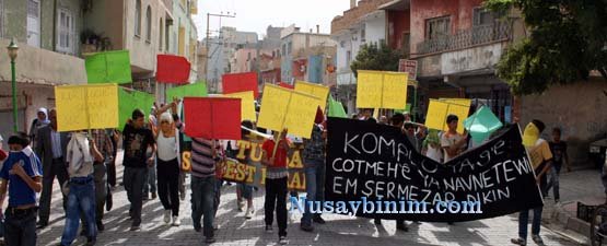 Barış ve Demokrasi Partisi (BDP) Nusaybin ilçe binası önünde toplanan grup, 27 Mayıs Caddesi üzerinde bulunan Hası Hüseyin Aksoy Camisi önünde kadar yürüyerek burada basın açıklaması yaptı.