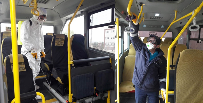 Şehir içi kooperatifine gelen Sağlık Daire Başkanlığı personeli tüm araçların içini ve dışını dezenfekte etti. Dezenfekte sonrası personeller özellikle yolcuların sık kullandığı el tutacaklarını temiz bezlerle temizledi.
